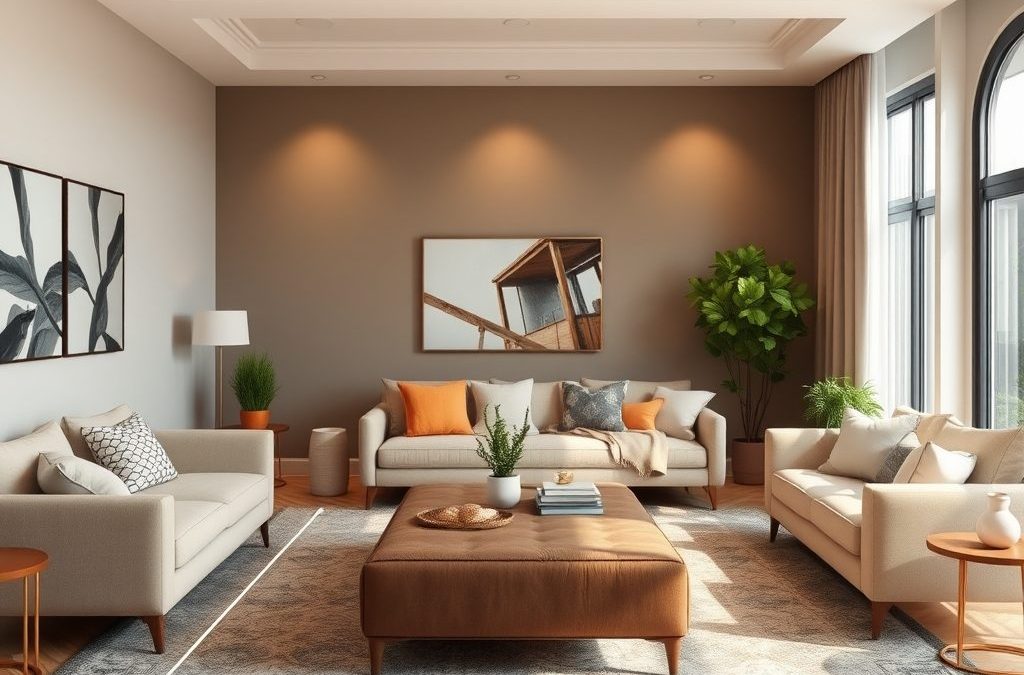 Kiedy planujesz układ, uwzględnij minimalne odległości między meblami – staraj się zachować co najmniej 60 cm szerokości w przejściach, aby umożliwić swobodne poruszanie się po przestrzeni. Ustaw meble tak, aby główne punkty, takie jak telewizor czy kominek, były dobrze widoczne z obszaru wypoczynkowego. Możesz przetestować układ, nanosząc na podłogę taśmę malarską lub wykorzystując wycięte z papieru modele mebli.